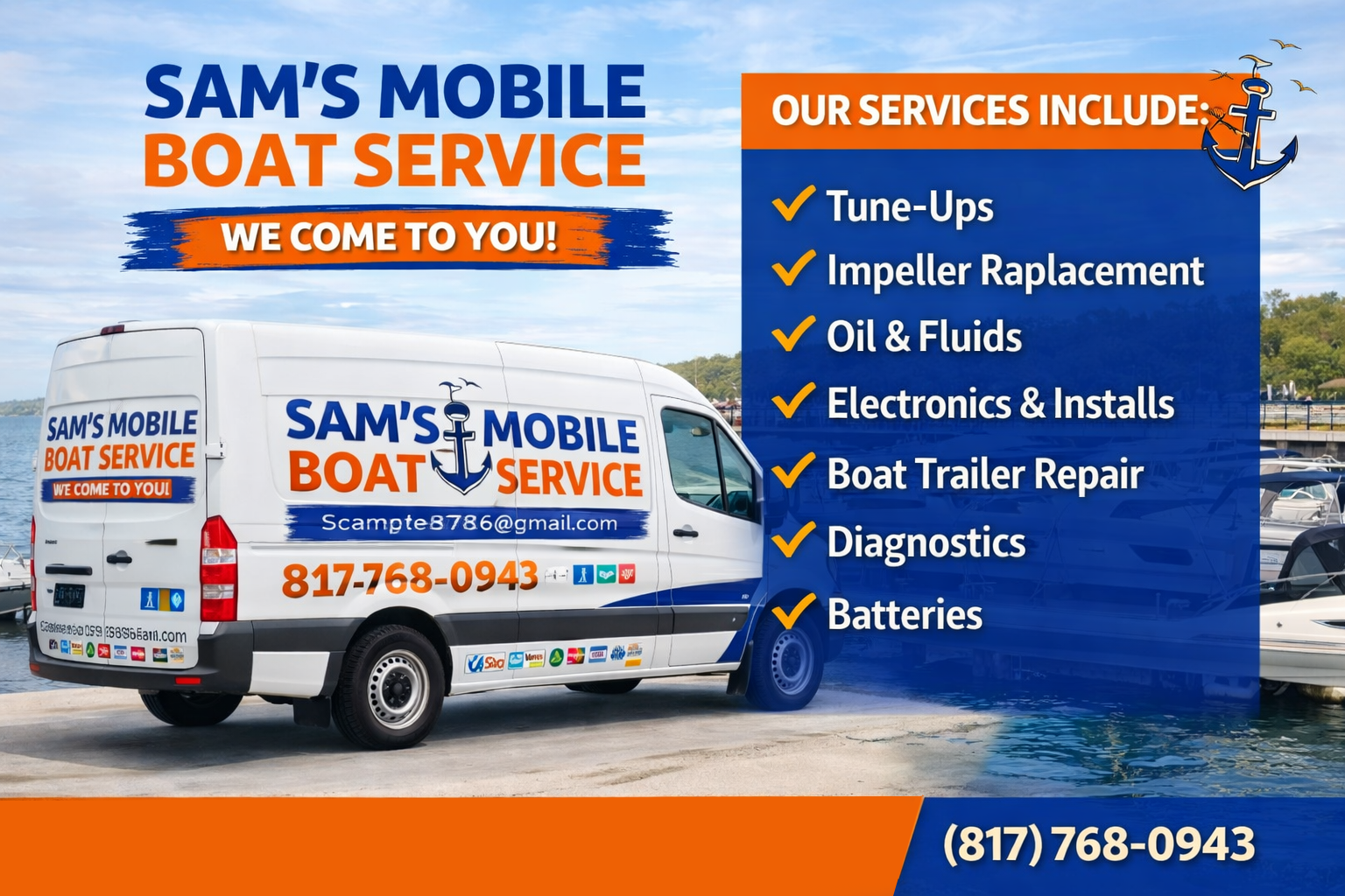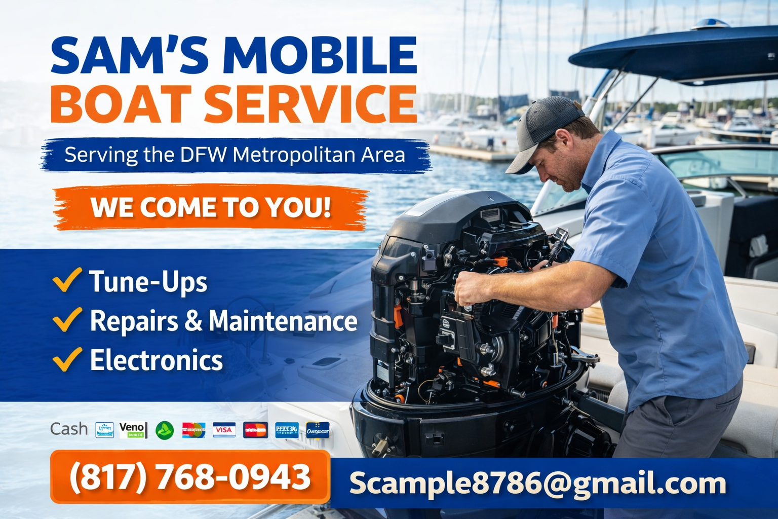 Sam’s Mobile Boat Service provides reliable, on-site marine service for boat owners throughout the Dallas–Fort Worth area. Instead of hauling your boat to a shop, we come to you, saving you time, hassle, and downtime on the water.